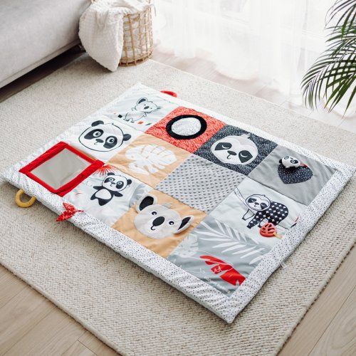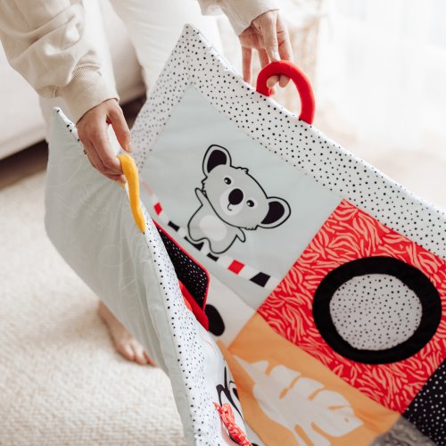 Vzdělávací podložka Canpol babies se snadno skládá, má pohodlnou rukojeť, díky které se snadno přenáší, takže můžete vytvořit dětský prostor, kdekoli budete potřebovat. Velké zrcátko povzbuzuje a prodlužuje lezení na bříšku, během kterého může miminko pokaždé prozkoumat různé části podložky. Velké množství smyslových prvků zapojuje dětské smysly: zrak, sluch a hmat. Různé textury materiálů, kontrastní barvy a vzory a jemné zvuky jsou skvělou zábavou pro rozvíjející se smysly vašeho miminka od prvních okamžiků života.