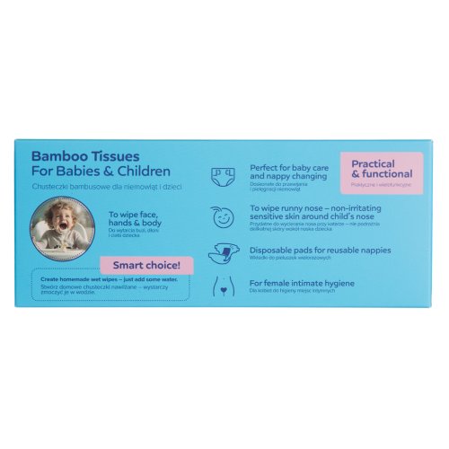 Vyrobeno z jemné bambusové netkané textilie, která je přirozeně antibakteriální. Neobsahují chemikálie, konzervační látky ani jiné vonné látky, které by mohly u dítěte vyvolat alergickou reakci. Nebělené chlórem.