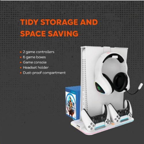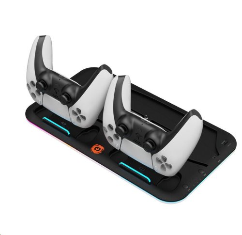 Napájení pomocí USB-C USB 2.0 pro nabíjení dalších zařízení RGB Úložiště disků a herního příslušenství Nabíjení dvou ovladačů PS5 Držák sluchátek Barva černá