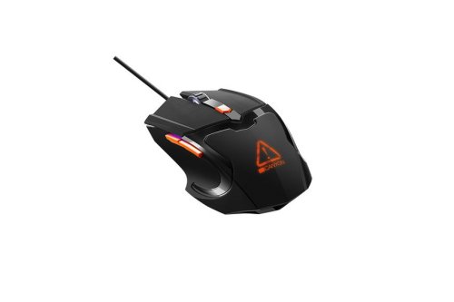 Drátová herní myš s 6 nastavitelnými tlačítky, pixart optický senzor, 4 úrovně DPI až do úrovně 3200, životnost až 3 miliony kliknutí, USB PVC opletený kabel v délce 1,65m, pogumovaný povrch a barevná RGB podsvícení, rozměr125x75x38mm, váha 140g