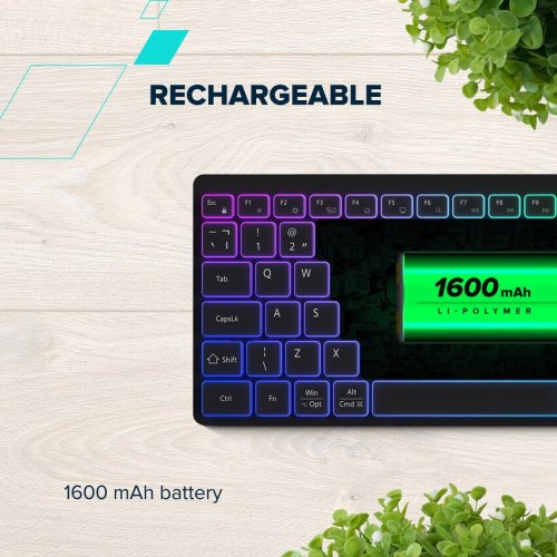 Klávesnice má 113 kláves s nůžkovým mechanismem, který zajišťuje tiché, plynulé a pohodlné psaní. RGB podsvícení v 7 barvách a osvětlení kláves vám umožní pracovat i ve tmě a zároveň dodá pracovnímu prostoru styl. Odolnost proti polití chrání klávesnici před drobnými nehodami a vestavěná 1600mAh baterie zajistí dlouhou výdrž bez nutnosti výměny baterií.
