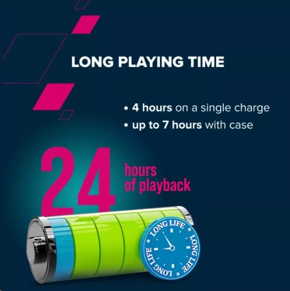 V každém sluchátku je 30mAh baterie, takže na jedno nabití vydrží až 24 hodin přehrávání. Přiložené nabíjecí pouzdro s kapacitou 200 mAh nejenže udrží vaše sluchátka v bezpečí, ale také nabízí několikanásobné další nabití.