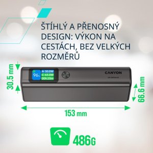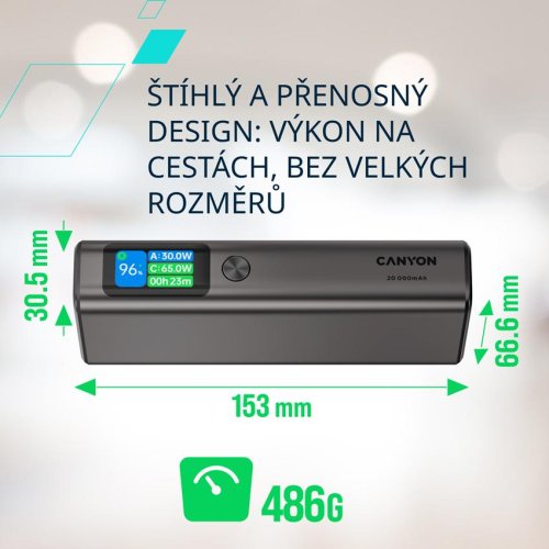 Powerbanka Canyon OnPower 230 nabízí kapacitu 20 000 mAh a výkon až 130 W pro rychlé nabíjení notebooků, telefonů i tabletů.