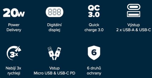 Kapacita 30 000 mAh vhodná pro opakované dobíjení zařízení Dodávejte energii více přístrojům současně přes dvojici USB a USB-C výstup Bleskové dobíjení zajistí technologie Qualcomm Quick Charge 3.0 a Power Delivery Kompaktní rozměry usnadní přenášení v tašce či batohu Minimalistický displej informuje o aktuálním stavu baterie
