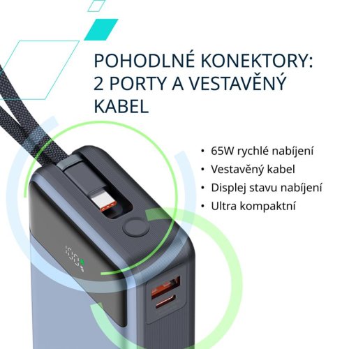 Vestavěný kabel USB-C vám usnadní nabíjení. K nabíjení zařízení i samotné powerbanky vám stačí jeden kabel. Již žádná starost se zamotanými kabely nebo ztracenými nabíječkami.