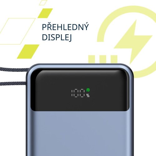 Přehledný displej powerbanky umožňuje snadno sledovat zbývající energii, úroveň výstupu a stav nabíjení.