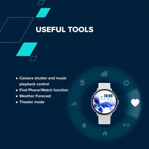 Užívejte si praktické funkce, jako je ovládání fotoaparátu a přehrávání hudby, různá další nastavení, funkce Najít telefon/hodinky a budík. Mějte přehled o počasí díky funkci Předpověď počasí, která vám zajistí, že budete vždy připraveni na jakékoli podmínky. Ve chvílích, kdy potřebujete zůstat diskrétní, přepněte na režim Divadlo, abyste měli ztlumenou obrazovku a vypnuté vibrace. Potřebujete rychlou přestávku? Ponořte se do našich poutavých her a užijte si zábavu na cestách.