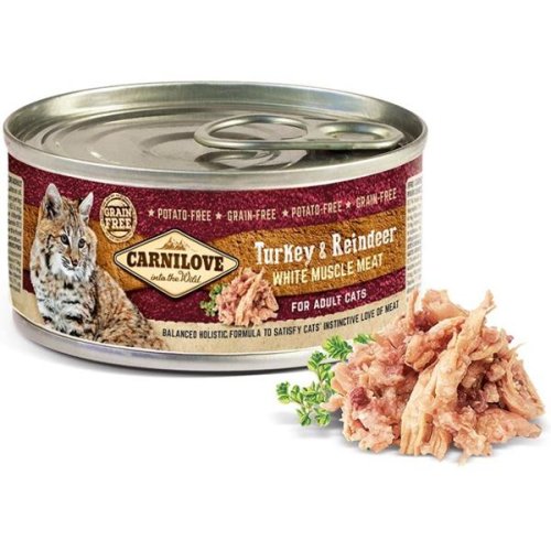 Konzerva pro kočky s bílým krocaním masem ze svaloviny a chutným sobím masem.