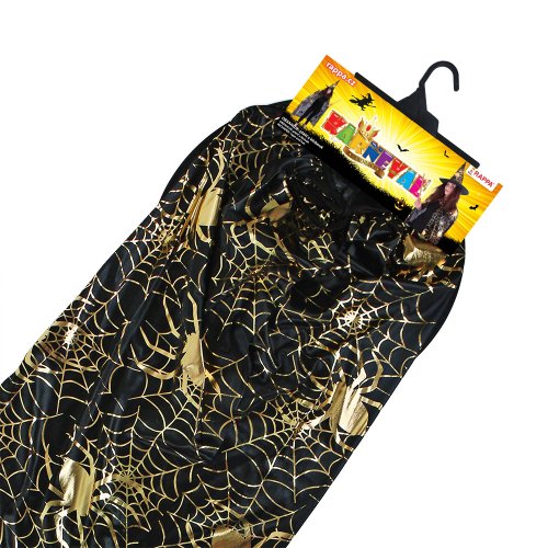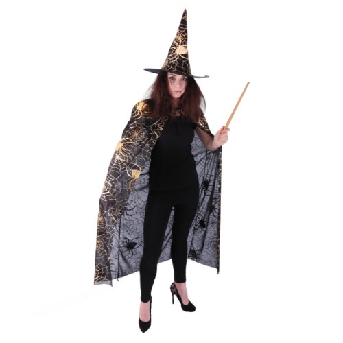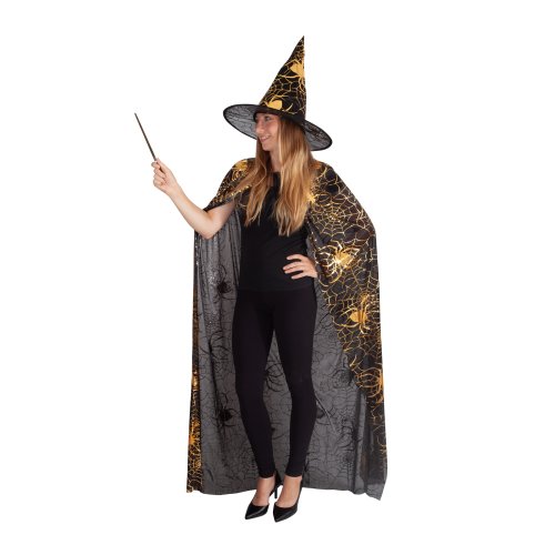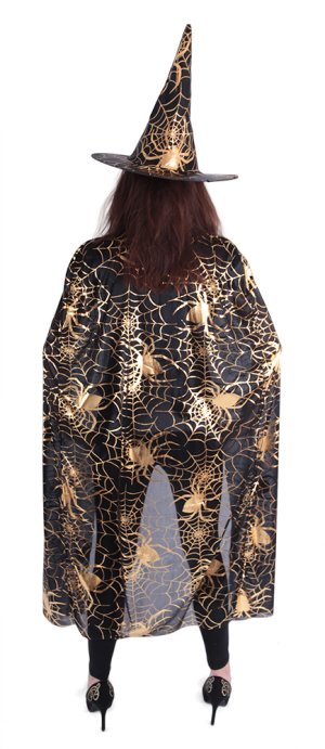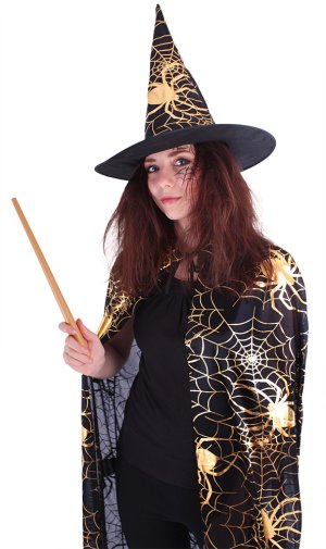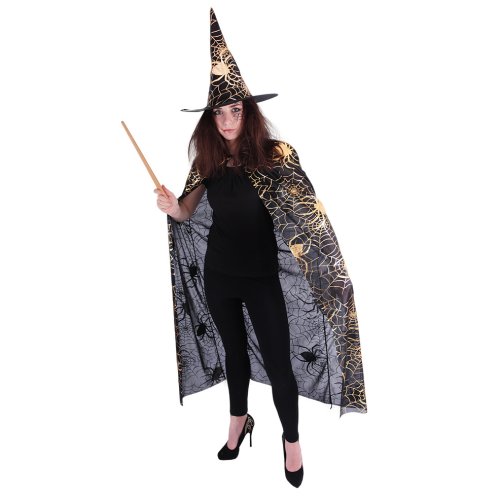 Krásný komplet na karneval nebo Halloween! Souprava zahrnuje černý plášť, který je dekorován halloweenskými motivy zlaté barvy a perfektně sladěný klobouk. Senzace! Doporučeno pro dospělé. Hůlka není součástí balení.