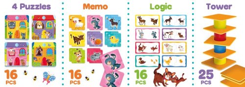 Krásná sada 4 různých her pro malé děti. Sada obsahuje pexeso (16 kusů), puzzle (4 obrázky), spojení máma a mládě (16 kusů) a věž (25 kusů). Vyrobeno z bezpečných materiálů vhodné pro děti od 1 roku. Carotina je značka společnosti Lisciani a představuje její vzdělávací jádro. Značka je především zaměřena na předškoláky a kojence.