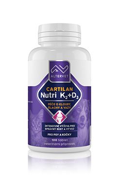 CARTILAN Nutri K2+D3, přípravek vyvinutý pro maximální lubrikaci kloubního pouzdra a výživu kloubní chrupavky. Ideální volba pro štěňata a mladé psy, zvláště při zvýšeném nároku na pohybový aparát v období růstu. Díky vysokému obsahu chondroitinu a glukosaminu také vhodný pro seniory, kteří potřebují intenzivně vyživit pohybový aparát. Přípravek neobsahuje MSM a je správnou volbou zejména pro skupinu pacientů bez závažných ortopedických problémů.