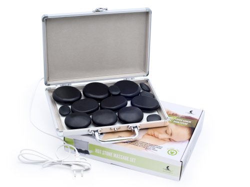 Sada obsahuje 14 kusů masážních lávových kamenů různého tvaru a velikostí pro dokonalou masáž celého těla. Kameny jsou uložené v hliníkovém kufříku, který jednoduše připojíte do el. sítě a necháte kameny nahřát na teplotu, která je vám příjemná (max. 70°C). Součástí balení jsou 2ks bandáží na chodidla pro praktické zafixování masážní kamenů.