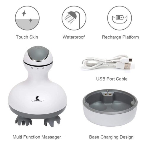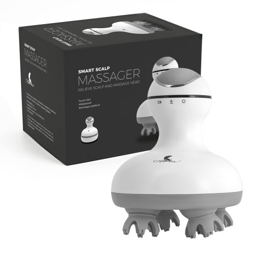 Balení obsahuje masážní přístroj, 4 odnímatelné masážní hlavice, nabíjecí stanici, kabel microUSB, manuál.