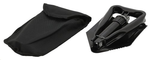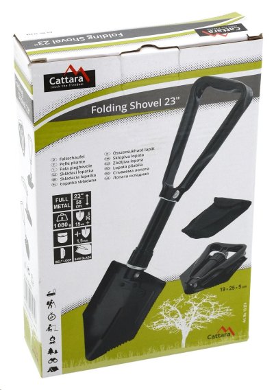 Lopatka má rozměry ve složeném stavu 15 x 24 cm a prodávána je spolu s odolným textilním pouzdrem černé barvy, které lze připevnit za opasek.