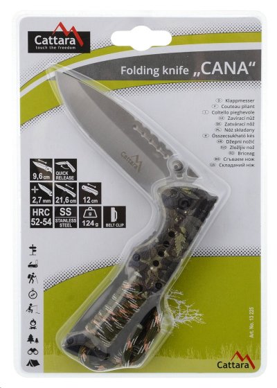 Skládací 21,6cm kapesní nůž Cattara Cana je nezbytnou součástí výbavy pro camping, rybaření a většinu outdoorových aktivit. Čepel nože je zhotovena z nožířské oceli 420J2, délky 9,6 cm o síle 2,7 mm. Tato slitina chromu, niklu, manganu, křemíku, fosforu, uhlíku, síry a železa dosahuje vynikající tvrdosti HRC52-54 a je obzvláště vhodná do nepříznivého prostředí, kde exceluje svou odolností vůči korozi a vnějším vlivům.