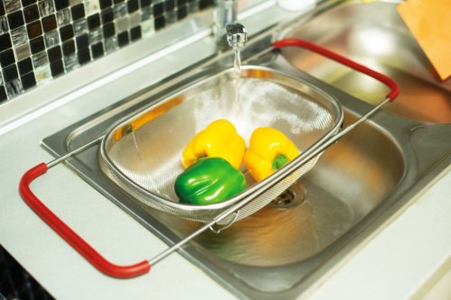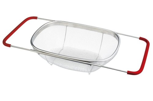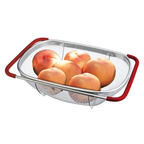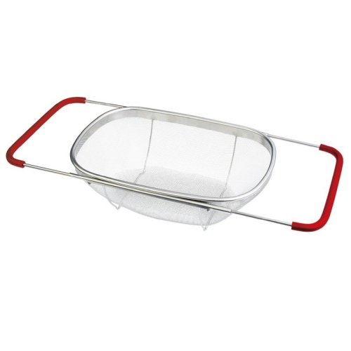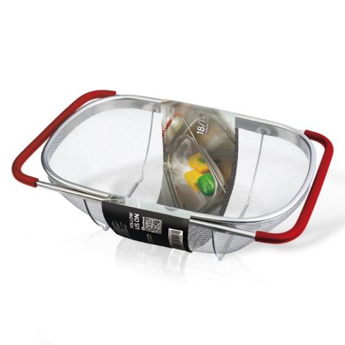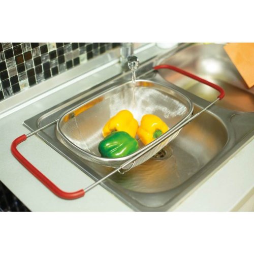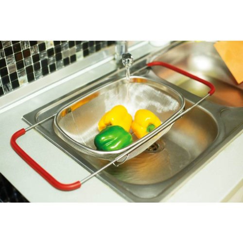 Praktický kuchyňský košík, který lze pohodlně umístit přímo do Vašeho dřezu. Díky vysunovacím rukojetím se dokonale přizpůsobí na šířku jakéhokoliv kuchyňského dřezu. Následně jej můžete využít jako cedník ke slévání těstovin nebo jako síto pro čištění potravin, zeleniny a ovoce. Tento velký cedník je vyrobený z nerezové oceli, má pevnou konstrukci a jeho postranní rukojeti se silikonovou úpravou nekloužou a dobře drží ve dřezu.