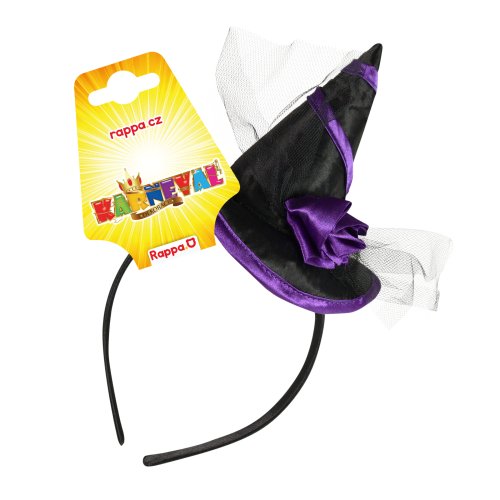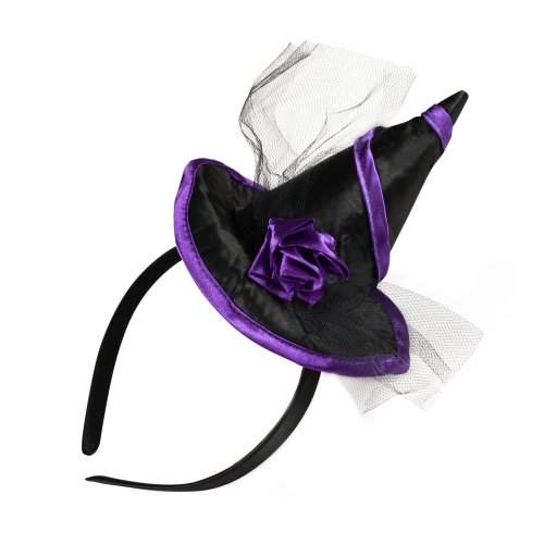 Stylová čelenka je perfektním doplňkem na večírek nebo Halloween párty! Černo-fialová čelenka je doplněna saténovým mini kloboučkem a tylovou ozdobou s květinou.