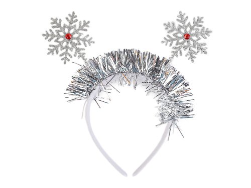 Čelenka s třpytivými vločkami je působivým doplňkem na vánoční večírky, zábavu, karneval, rodinná setkání, školní představení nebo na Silvestra. Skvěle se hodí i do fotokoutku. Vločky jsou na pružince a z přední strany mají glitry. Dále čelenku zdobí lesklé lamety. Výška vloček u varianty č. 1 je 7 cm. Výška vloček u varianty č. 2 je 11 cm.