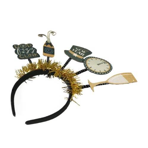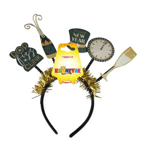 Černozlatá čelenka obohacena drobnými prvky typickými při novoročních oslavách. Ideální ozdoba do vlasů na oslavu nebo večírek při vítání Nového roku!