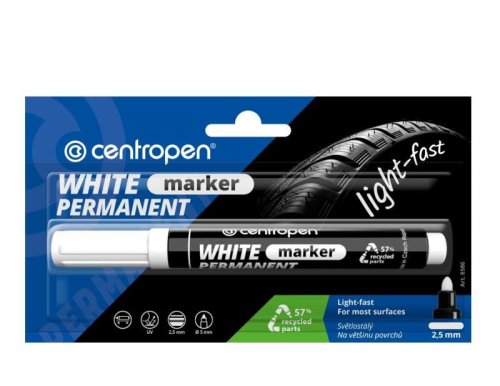 Univerzální bílý značkovač, píše na většinu povrchů, po zaschnutí odolá za sucha otěru, na porézních površích permanentní, světlostálý, vodní báze, skladovat ve vodorovné poloze, válcový hrot, šířka stopy 2,5 mm, 97 % recyklovaného materiálu.