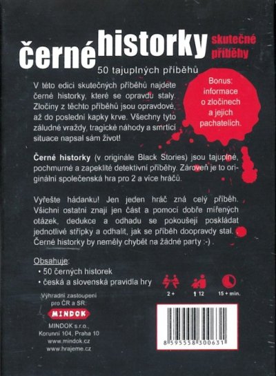 Historky založeny na zločinech, které se skutečně udály. Černé historky jsou zapeklité, morbidní a mysteriózní záhady pro teenagery a dospělé s jakýmkoliv vztahem k hrám. Hráči se snaží zrekonstruovat celou historku pomocí otázek, na které jim moderátor odpovídá pouze "ano" nebo "ne". Strašidelná hra na jakoukoliv párty, k vodě nebo třeba na cestu autem. Pravidla hry: