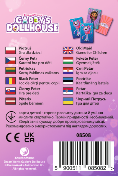 Kdo se zbaví všech svých karet se stejným označením a komu na konci hry zůstane v ruce Černý Petr? Hrou Vás budou doprovázet postavičky z oblíbeného seriálu Gabby. Karty: 25 karet - 12 dvojic označených stejnou číslovkou + 1 Černý Petr Rozměr krabičky: 6 x 9 cm Vhodné od 4 let