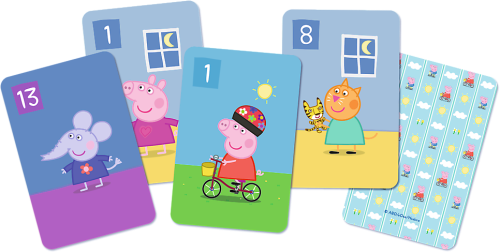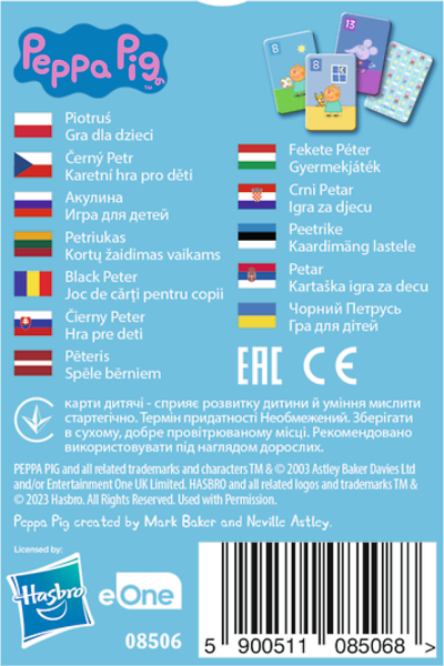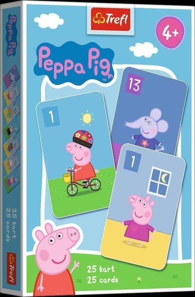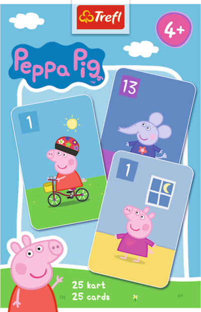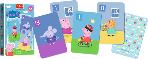 Kdo se zbaví všech svých karet se stejným označením a komu na konci hry zůstane v ruce Černý Petr? Hrou Vás budou doprovázet postavičky z oblíbeného seriálu Prasátko Peppa. Karty: 25 karet - 12 dvojic označených stejnou číslovkou + 1 Černý Petr Rozměr krabičky: 6 x 9 cm Vhodné od 4 let