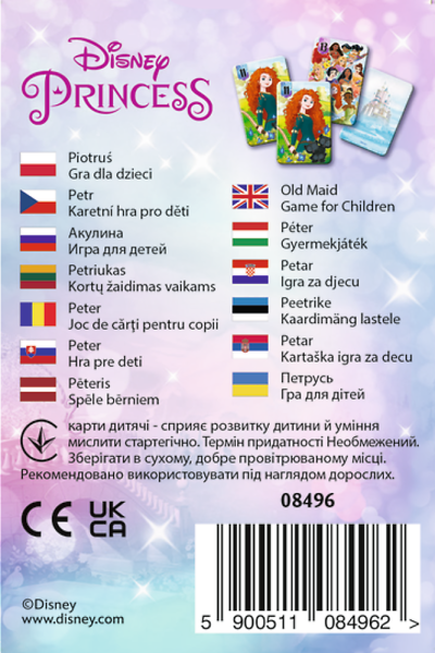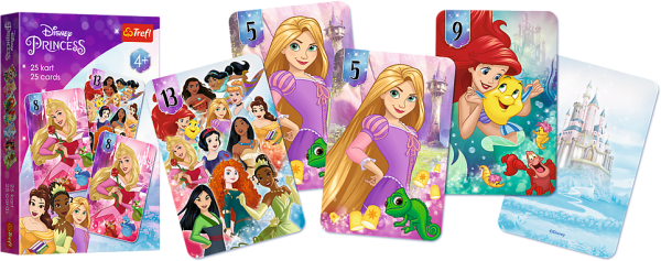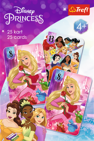 Kdo se zbaví všech svých karet se stejným označením a komu na konci hry zůstane v ruce Černý Petr? Hrou Vás budou doprovázet princezny z produkce Disney. Karty: 25 karet - 12 dvojic označených stejnou číslovkou + 1 Černý Petr Rozměr krabičky: 6 x 9 cm Vhodné od 4 let