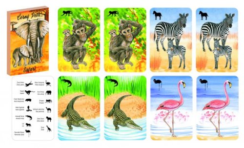 Dětské karty pro hru zvanou Černý Petr s obrázky zvířátek ze safari. Krabička obsahuje i podrobný návod a karty mají na rubové straně mírně zdrsnělý povrch pro lepší manipulaci s nimi.