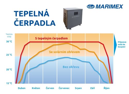 Ohřejte si vodu v bazénu pomocí čerpadla Marimex Premium 3500 a prodlužte si koupací sezónu o pár měsíců. Zajistí ohřev v bazénech až do 15 m³ i bez slunečního záření. Čerpadlo nevyžaduje žádnou náročnou údržbu a jeho obsluha je snadná. Marimex Premium 3500 má funkci odmrazování, LED displej a můžete ho připojit přes Bluetooth. Pokud potřebujete připojit výkonnější filtraci, průtok můžete přizpůsobit třícestným regulačním ventilem. Čerpadlo je šetrné k životnímu prostředí, což jistě ocení mnozí z vás. Využívá obnovitelné zdroje energie a při jeho provozu nevznikají žádné plynné odpadní látky, které by znečišťovaly ovzduší.