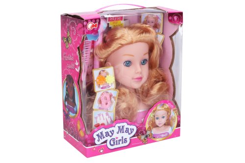 Česací hlava set. Velikost 22 cm. Obsah - hlava, fén, kulma, hřeben, 2 sponky, gumička.