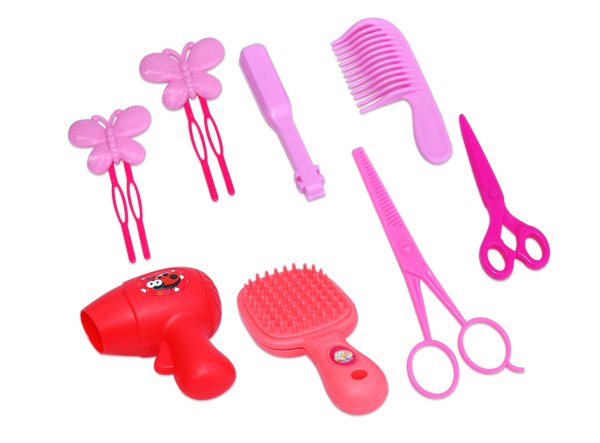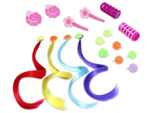 Česací hlava s příslušenstvím. Velikost 22 cm. Součástí hřeben, kulma, barevné prameny vlasů, sponky. Věk: 3+