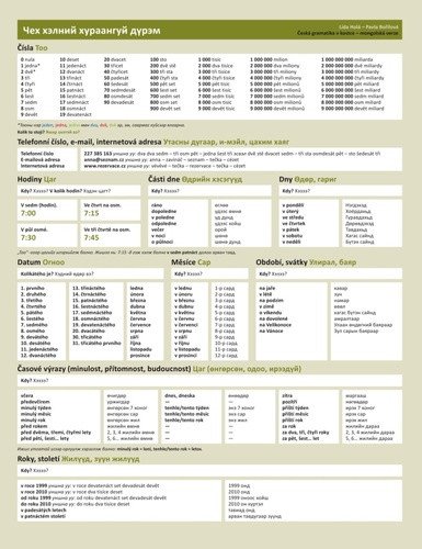 Česká gramatika v kostce - mongolská je čtyřstránková příručka o něco většího formátu než A4, tištěná na oboustranně laminované křídě. Její inovovaná, rozšířená verze z roku 2010 je určena začátečníkům a středně pokročilým studentům češtiny jako cizího jazyka, k občasnému nahlédnutí ji však využijí i pokročilí mluvčí. Představuje jednoduchý přehled základních gramatických a lexikálních jevů, důležitých pro úspěšnou každodenní komunikaci, který je vždy po ruce. Nekopíruje mechanicky tradiční gramatická pravidla, ale přizpůsobuje výklad vnímání a potřebám cizojazyčných mluvčích (využívá např. barevné kódování pro značení gramatického rodu, zjednodušené schéma ilustrující vyjadřování směru a lokace apod.).