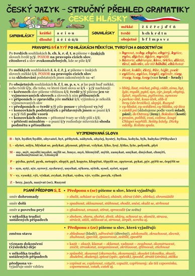 Laminátová skládačka určená především pro žáky základních a středních škol nabízí graficky přehledný a stručný přehled gramatiky českého jazyka. Obsahuje praktické návody na psaní i/y, s/z, ú/ů, mě/mně i s příklady, vyjmenovaná slova, popis a dělení jednotlivých slovních druhů, skloňování podstatných a přídavných jmen, zájmen a číslovek, časování sloves, základní přehled i určování větných členů a hlavních i vedlejších vět.