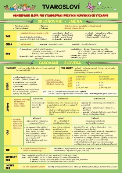 Tato laminová kartička je určená především pro studenty základní a střední školy. Studenti se zde v přehledné formě dozvědí, jakým způsobem se v češtině tvarují slova, co je to pád, rod, číslo, vzor a podle jakých pravidel dojdeme k jejich správnému užití. V tomto hezkém provedení by tato karta měla studentům sloužit jako odrazový můstek ke správnému praktickému užití látky během studia.