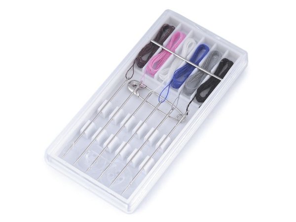 Cestovní šitíčko se hodí mít na každou dovolenou. Díky své malé velikosti se vejde do každé dámské kabelky, prakticky jej můžete mít stále u sebe i ve všední dny. Víčko krabičky se otevírá vysunutím. Sada obsahuje: 6 jehel s navlečenými nitěmi, 2 transparentní knoflíčky Ø10 mm a spínací špendlík.