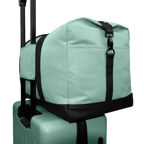 • Odnímatelný nastavitelný ramenní popruh., * Rukojeť pro snadnější přenášení., * Možnost připevnění na kufr pomocí zadního popruhu na zip, který lze případně využít také jako další kapsu., * Spodní část tašky potažena materiálem v černé barvě, odolným proti vodě a nečistotám., * Taška z voděodolného materiálu Ripstop., * Materiál z 50 % z recyklovaného polyesteru vyrobeného z recyklovaných PET lahví., * Materiál s impregnací proti vodě a špíně., Tip: Cestovní tašku si můžete barevně sladit s praktickými doplňky jako je kufr, kosmetický kufřík nebo ledvinka., Obrázek upevnění tašky na kufr  je pouze ilustrační.