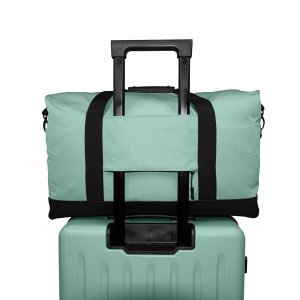 • Odnímatelný nastavitelný ramenní popruh., * Rukojeť pro snadnější přenášení., * Možnost připevnění na kufr pomocí zadního popruhu na zip, který lze případně využít také jako další kapsu., * Spodní část tašky potažena materiálem v černé barvě, odolným proti vodě a nečistotám., * Taška z voděodolného materiálu Ripstop., * Materiál z 50 % z recyklovaného polyesteru vyrobeného z recyklovaných PET lahví., * Materiál s impregnací proti vodě a špíně., Tip: Cestovní tašku si můžete barevně sladit s praktickými doplňky jako je kufr, kosmetický kufřík nebo ledvinka., Obrázek upevnění tašky na kufr  je pouze ilustrační.