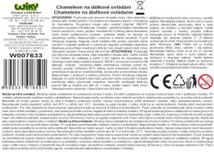 RC Chameleon s vystřelovacím jazykem. Velikost 28 cm. Světelné efekty (změna barev, 5 barev). Funkce - rotace očí, pohyb ocasem, vystřelovací jazyk, pohyb do 4 směrů. Obsahuje 5 žetonů a ovladač. Posbírejte žetony s obrázky hmyzu pomocí jazyku. Napájení ovladač 2 x AAA baterie, chameleon 4 x AA baterie. Návod k použití na obalu.