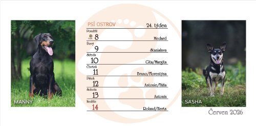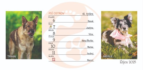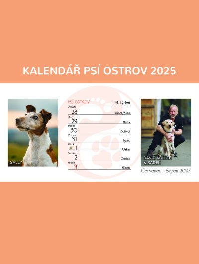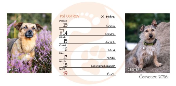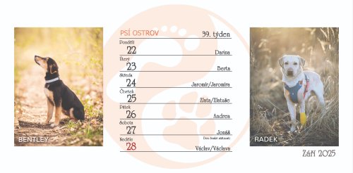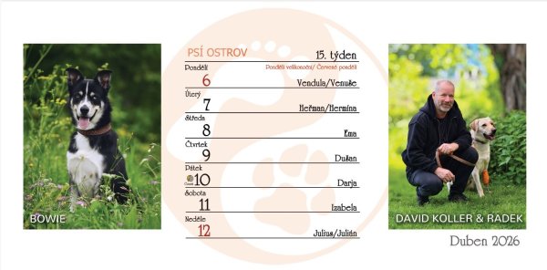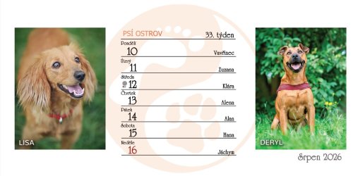 Charitativní kalendář na rok 2026 je opět stolní, týdenní, se stojanem z tvrdého papíru, tištěný na lesklém křídovém papíře a s kroužkovou vazbou. Obsahuje fotografie pejsků, kteří v nouzi našli útočiště na Psím ostrově. Jsme nesmírně vděční a vážíme si osobního přínosu ambasadorů Davida Kollera, Petra Švancary, Sandry Pogodové, Vladimíra Polívky a Ivana Luptáka.