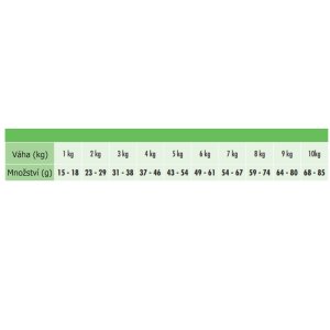 Nutriční doplňkové látky v 1 kg: Vitamin A 12 000 I.U., Vitamin D3 900 I.U., Vitamin E 100 I.U., Taurin 675 mg, síran měďnatý pentahydrát 8,75 mg, oxid zinečnatý 50 mg, uhličitan železitý 87,50 mg, oxid manganatý 17,50 mg, jodičnan vápenatý bezvodý 1,00 mg, Seleničitan sodný 0,13 mg. Technologické přísady: konzervační látky; antioxidanty.