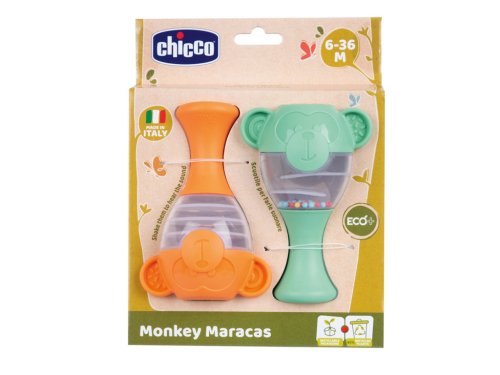 Dvě maracas ve tvaru zábavných opiček, snadno se dají uchopit a zatřást, abyste slyšeli chrastící zvuky. Vyrobeno z recyklovaného plastu.