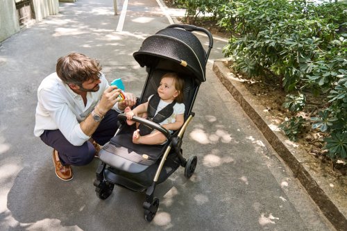 Samoskládání Stačí jeden dotek a kočárek se sám složí! Po složení je opravdu kompaktní a stojí samostatně. Madlo lze také poskládat pro dosažení větší kompaktnosti nebo může být použito jako rukojeť pro přenášení.