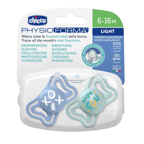 Šidítko Chicco Physio Light z řady Physioforma je aktivní ortodontický uklidňující dudlík s lehkou, extra větranou základnou, takže dítě ani neví, že má něco na obličeji. Tvarovaný kotouč s větracími otvory přizpůsobuje malé kontury obličeje miminka a pomáhá snižovat hromadění vlhkosti kolem úst. Navíc extra měkká savička pro větší pohodlí a menší klouzání pomáhá dítěti zůstat přisáté. Ergonomický tvar šidítka byl prokázán jako podporující správné fyziologické dýchání novorozenců. Pomáhá nastavit jazyk směrem k patru, tedy dopředu a nahoru, a tím učí od narození dítě správně dýchat nosem. Kromě toho toto anatomické šidítko podporuje správný vývoj čelisti. Nesprávné dýchání ústy, od kterého ergonomický tvar dudlíků Chicco Physioforma děti odrazuje, zvyšuje riziko SIDS a také přispívá k nesprávnému vývoji úst a čelisti. Šidítka jsou zabalená v sterilizační krabičce, kterou můžete mít vždy u sebe a použít v mikrovlnce ke sterilizaci šidítek za 3 minuty. Šidítko Physio Light je vynikající následné šidítko po šidítku Chicco Micró, ale také po jakémkoli jiném šidítku 0-2m.
