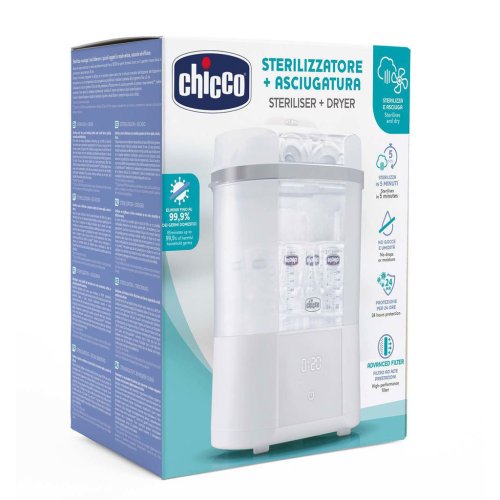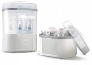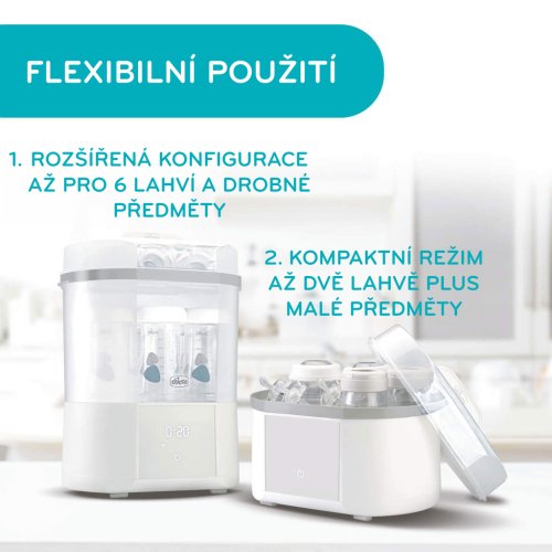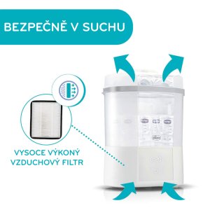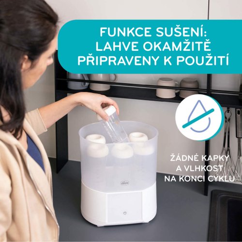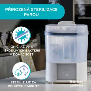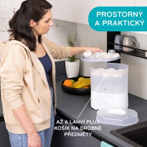 Sterilizátor s funkcí sušení zaručuje dezinfenkci kojeneckých lahví a jiných předmětů díky sterilizačním schopnostem přirozené páry. Je to nejpokročilejší řešení, jak sterilizovat rychle, přirozeně a efektivně již za 5 minut. Vejde se do něj až 6 lahví a příslušenství.