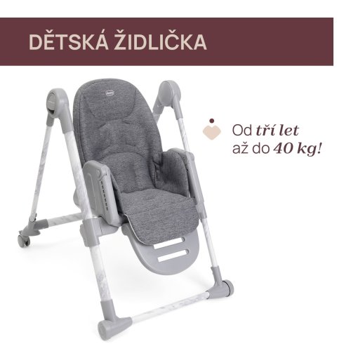 od 3 let až do 40 kg lze židli nastavit do pozice, ve které dítě může stolovat u jídelního stolu. Stačí odebrat tác, židli nastavit do potřebné výšky a přisunout ke stolu.