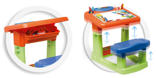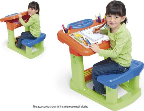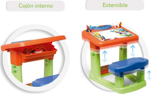 nastavitelná výška lavice i sedátka podle potřeb dítěte, stoleček s pohodlným a prostorným sedátkem, v desce stolečku je přihrádka pro různé potřeby ke kreslení a tvoření, pod lavicí je podnožka pro maximální pohodlí, vyrobena z vysoce odolného plastu, snadno se přemisťuje.