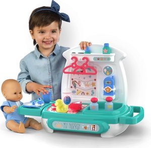 sada obsahuje: 16 příslušenství k péči o vaše dítě (hřeben se zrcátkem, lahvičku na pití, příbor, telefon a mnoho dalšího..)