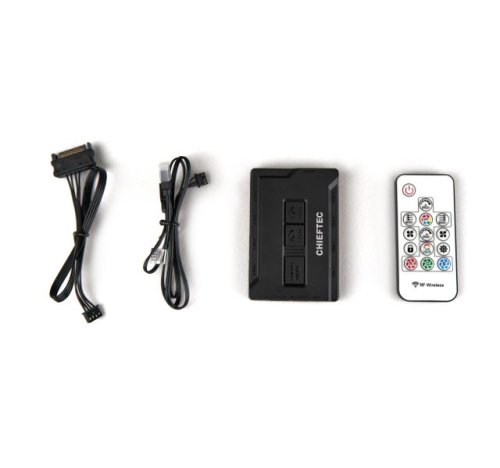 Součástí balení je dálkové ovládání a ARGB rozbočovač kompatibilní s ASUS Aura, ASRock RGB Sync, MSI Mystic Light a GIGABYTE RGB Fusion.