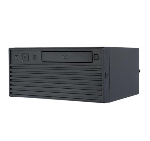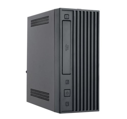 Černá počítačová skříň formátu Mini Tower. Na předním panelu naleznete port 2x USB 3.0, dále také konektor pro sluchátka a konektor pro mikrofon.